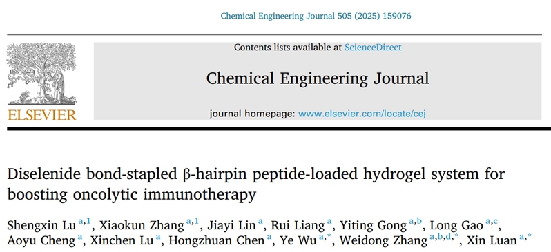 该工作近期以“Diselenide bond-stapled β-hairpin peptide-loaded hydrogel system for boosting oncolytic immunotherapy”为题,在国际化学知名期刊Chemical Engineering Journal发表研究成果。伟德研究生卢盛鑫和张笑堃为论文第一作者,栾鑫研究员、张卫东教授和吴也副研究员为论文通讯作者。