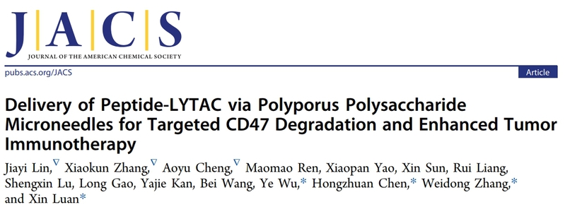 该研究工作近日以“Delivery of Peptide-LYTAC via Polyporus Polysaccharide Microneedles for Targeted CD47 Degradation and Enhanced Tumor Immunotherapy”为题在线发表于化学领域国际权威期刊Journal of the American Chemical Society。伟德研究生林佳谊、张笑堃和程傲宇为论文第一作者,栾鑫研究员、张卫东教授、陈红专教授和吴也副研究员为论文通讯作者。
