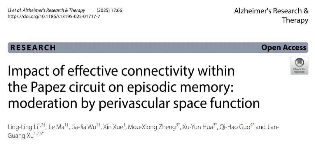 认知功能障碍已成为威胁全球公共健康的重大问题,其中遗忘型轻度认知障碍(amnestic mild cognitive impairment,aMCI)作为阿尔茨海默病的前期阶段,是延缓疾病进展和预防痴呆发生的关键时期。近日,国家中医康复中心主任徐建光教授团队在阿尔茨海默病领域权威期刊Alzheimer's Research & Therapy连续发表两篇论文,题为“Impact of effective connectivity within the Papez circuit on episodic memory: moderation by perivascular space function”和“Functional-structural co-dependent brain mapping of metamemory in amnestic mild cognitive impairment”。以上研究不仅从“神经环路-代谢废物清除-情景记忆”角度揭示了aMCI发病机制的复杂性,还强调元记忆在改善aMCI人群情景记忆中的重要性,为aMCI人群的临床干预策略提供新思路。