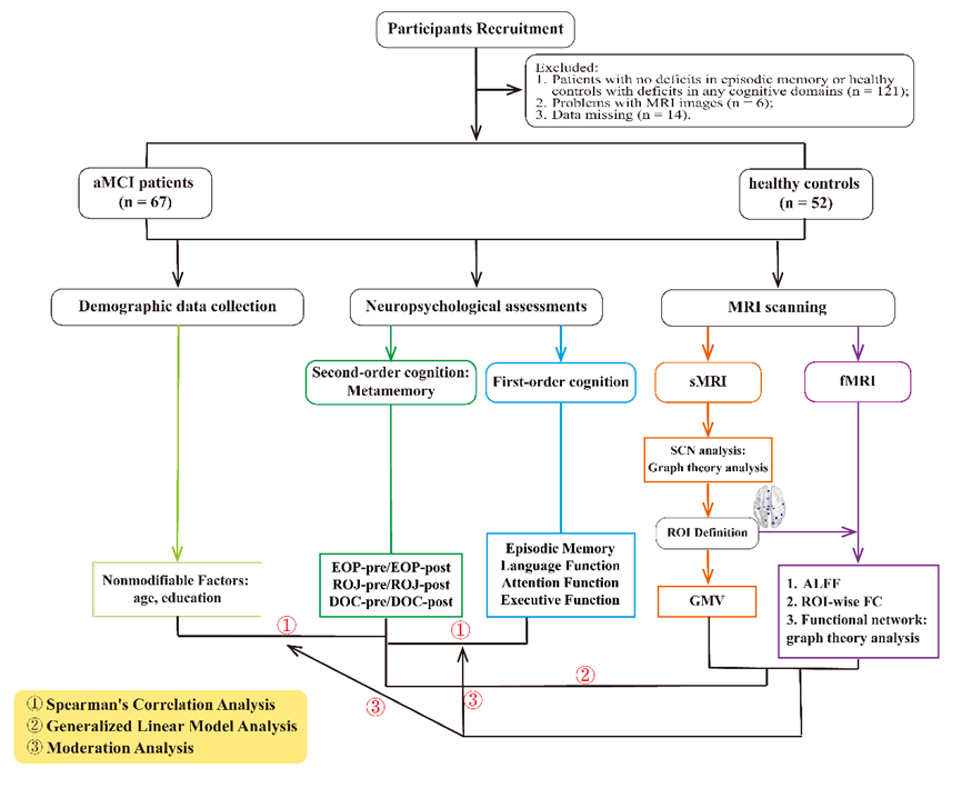 在认知功能层级中,元记忆作为元认知的核心成分,通过对自身记忆过程的监测与调控,影响基础记忆功能的表现,被视为一种内部预警机制,对外在记忆表现具有重要影响。针对aMCI人群,探索元记忆的神经机制对开发高阶认知干预策略具有重要意义。徐建光教授团队在前期研究基础上,进一步揭示了aMCI人群元记忆的脑重塑机制。