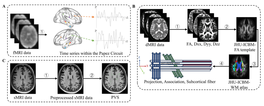 情景记忆的形成与提取依赖于多个脑区及神经网络的协同活动,其中Papez 环路发挥着核心作用。同时,血管周围间隙(PVS)作为脑内代谢废物清除的关键结构,其功能与认知水平的关联逐渐受到关注。然而,在aMCI人群中,Papez 环路与PVS功能如何共同影响情景记忆,此前尚未明确。团队通过多模态磁共振和神经心理学测试评估,系统揭示了Papez环路有效连接减弱与aMCI人群情景记忆受损之间的关系,并发现PVS功能在二者之间起到重要调节作用,这一发现为aMCI人群的认知康复提供了新方向,提示通过改善PVS功能(如促进脑内代谢废物清除)可能增强神经环路调控干预的效果,为制定联合治疗方案提供新思路。