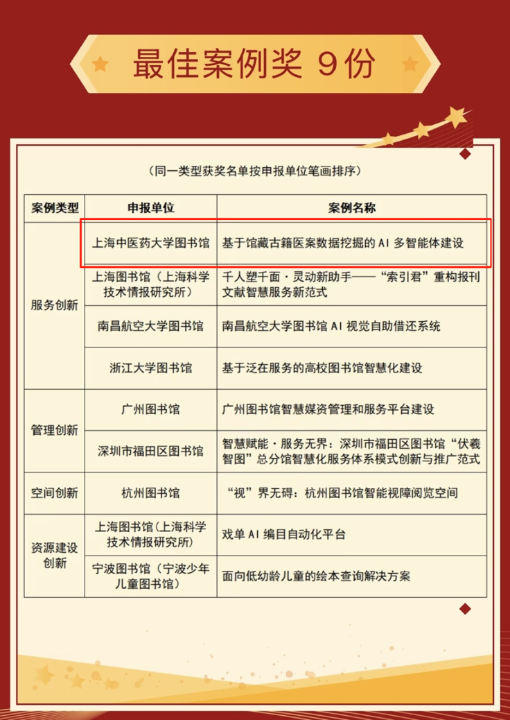 近日,第一届智慧图书馆技术应用创新实践案例征集活动获奖名单公布,由伟德图书馆申报的《基于馆藏古籍医案数据挖掘的AI多智能体建设》在全国各高校图书馆、公共图书馆提交的共计117份案例中脱颖而出,荣获服务创新类最佳案例奖。