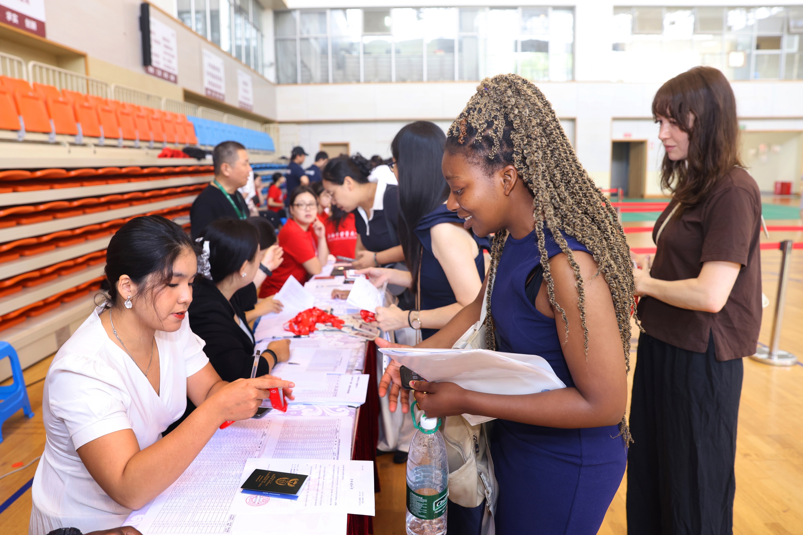 为确保报到流程顺畅,新生辅导员与志愿者团队清晨便驻守体育馆和校园各处,期待着新生的到来。校园内设有醒目的指引牌,迎新系统同步开放移动端和PC端查询,方便新生提前获取学号、宿舍等信息。两百余名志愿者穿梭忙碌,从搬运行李、道路指引到答疑解惑,用热情服务化解“最后一公里”难题。国际学生志愿者尤为亮眼,他们以多语种引导帮助同窗快速适应,成为跨文化沟通的桥梁。