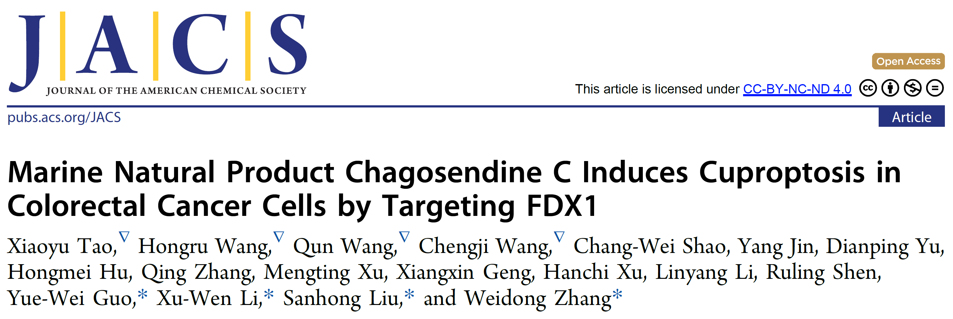 近日,伟德交叉科学研究院刘三宏研究员团队联合海军军医大学张卫东教授,中国科学院药物研究所李序文研究员、郭跃伟研究员团队,在国际知名学术期刊Journal of the American Chemical Society在线发表题为“Marine Natural Product Chagosendine C Induces Cuproptosis in Colorectal Cancer Cells by Targeting FDX1”的研究论文,揭示海洋来源天然产物Chagosendine C通过靶向FDX1诱导肿瘤细胞发生铜死亡,发挥抗结直肠癌作用。