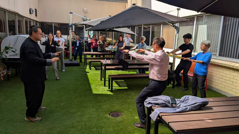 24日上午,代表团一行前往利物浦医院(Liverpool Hospital)癌症治疗中心(Caner Therapy Center)举办了一场别开生面的太极拳展示教学活动。陈超洋医师现场演示了杨氏太极拳与易筋经的精华动作,并现场教学了“起势、开合、云手、换掌”等太极拳基础招式,吸引了该中心的工作人员积极参与。