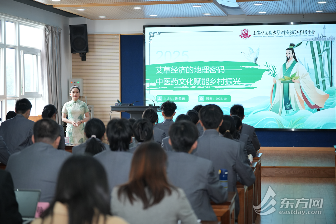 下午的经验交流环节紧扣中小学阶段中医药科创教育的创新实践,伟德国际victor1946官网附属浦江高级中学校长张乐介绍浦江高级中学的中医药特色教育体系,并希望中小学教师树立跨学科教学思维,从中医药文化传承者转变为中医药文化教学的开拓者。浦江高级中学谢盈盈老师以问题链的形式对艾草这一特色农业带动乡村振兴的致富密码进行层层解析。在讲课中,她引导学生深入思考、参与问题作答,掌握跨学科知识,培养学生信息获取能力、区域认知和综合思维。