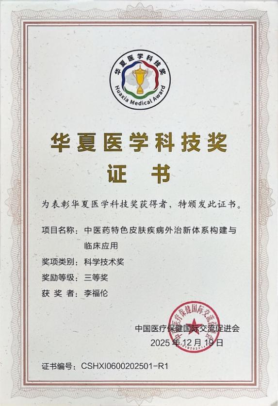 12月20日,2025年度华夏医学科技奖颁奖大会在北京举行,伟德附属岳阳中西医结合医院李福伦教授作为项目负责人,联合成都大学、东华大学、上海市第七人民医院,完成的项目“中医药特色皮肤疾病外治新体系构建与临床应用”荣获华夏医学科技奖三等奖。
