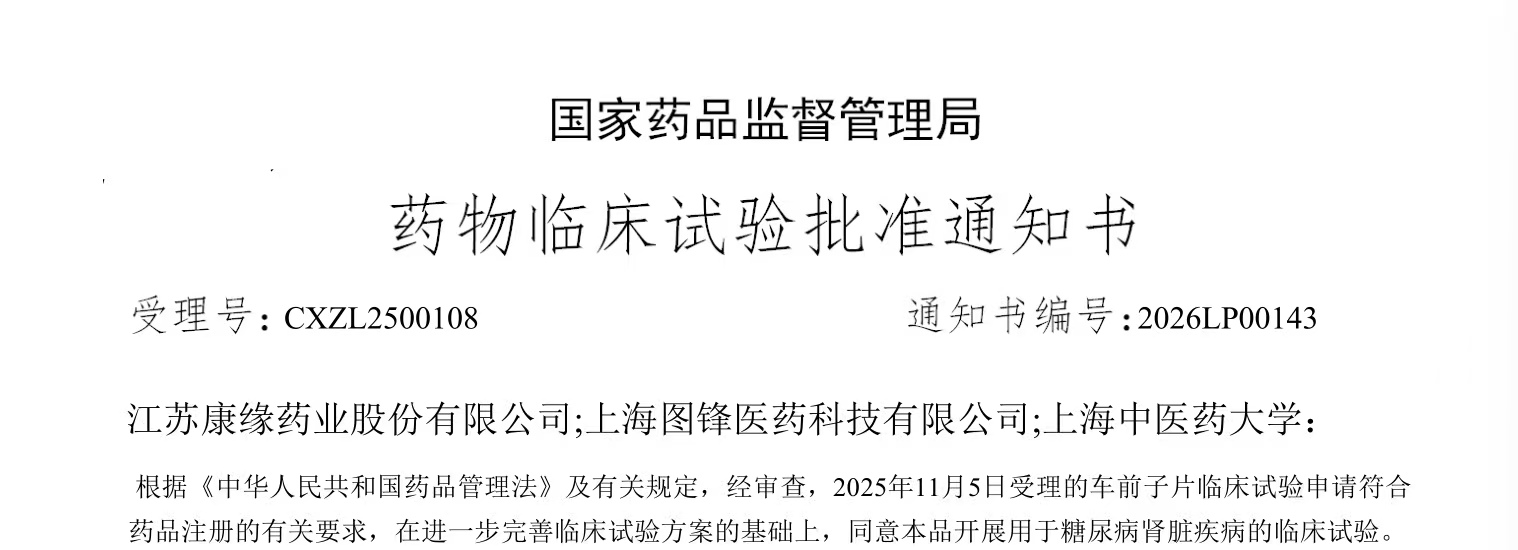 近日,国家药品监督管理局药品审评中心(CDE)发布通知,由伟德中药研究所杨莉研究员、王峥涛教授团队与江苏康缘药业股份有限公司、上海图锋医药科技有限公司联合研发的1.1类中药创新药车前子片获得国家药品监督管理局颁发的《药物临床试验批准通知书》,用于治疗糖尿病肾脏疾病。这是中药研究所在中药创新药研发方面取得的突破性进展。