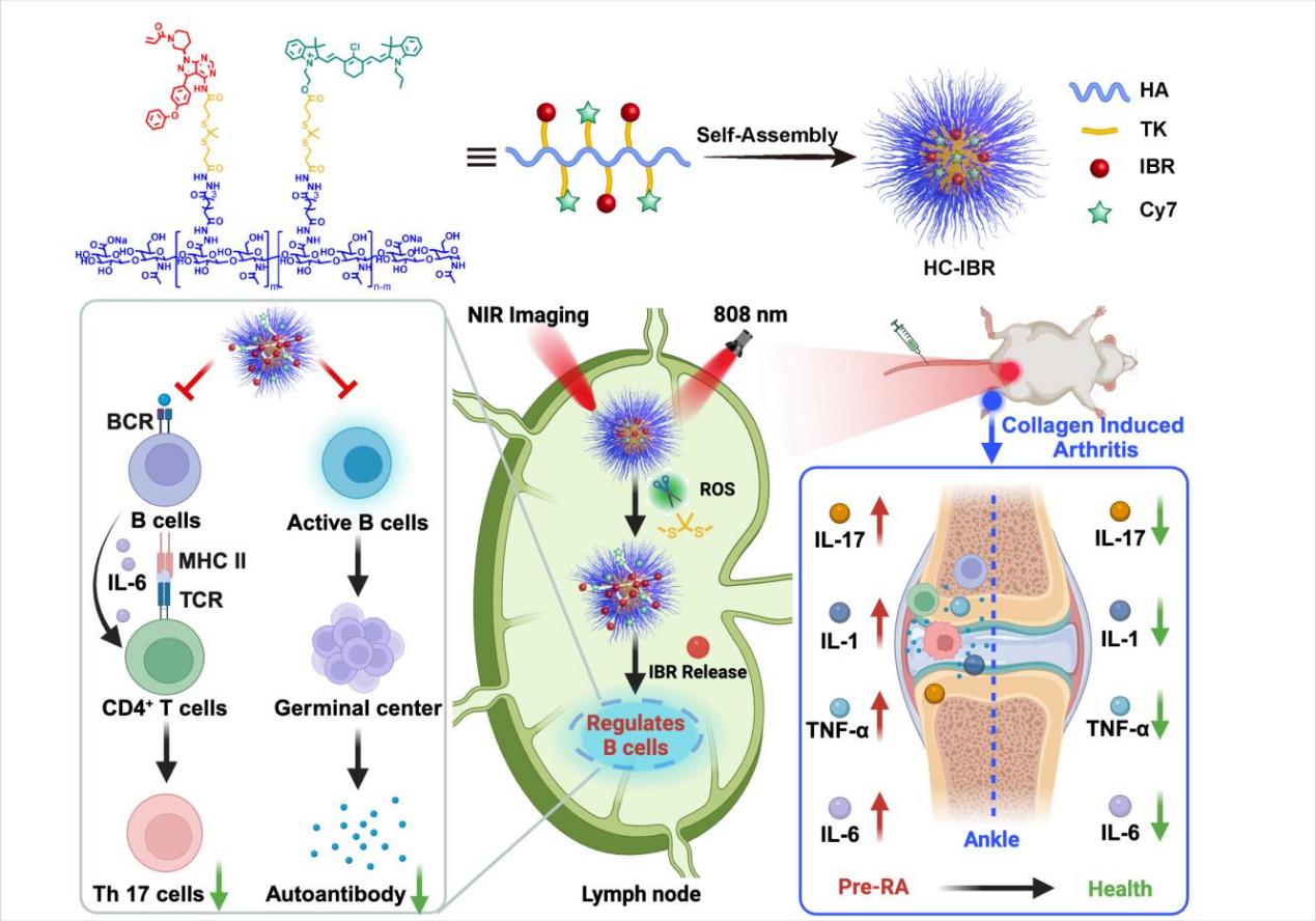 淋巴结是RA自身免疫反应发生的关键免疫器官。该研究设计了一种基于透明质酸的纳米前药(HC-IBR),兼具淋巴结靶向、近红外光控释药与荧光实时示踪三重功能。HC-IBR可特异性富集于淋巴结,并在外部激光照射下局部释放布鲁顿酪氨酸激酶抑制剂伊布替尼,从而避免伊布替尼系统性给药的潜在副作用。