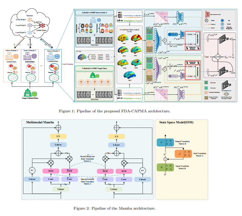 研究团队创新性地提出了“联邦域适应+共激活模式+多模态Mamba”三位一体的技术框架(FDA-CAPMA)。在方法学层面,团队采用共激活模式(CAP)分析提取大脑动态功能状态,将高维fMRI信号压缩为具有生物学意义的离散脑状态序列;引入状态空间模型Mamba架构,实现跨模态特征的高效融合与长程时序依赖建模;设计局部最大均值差异(LMMD)模块,在保护数据隐私的前提下完成跨中心分布对齐。在全球最大的多中心抑郁症数据集(Rest-meta-MDD,1,813例)上验证,该框架准确率达67.16%,显著优于传统图神经网络和Transformer方法。研究的说服力在于“隐私保护与性能提升的双重验证”:在严格保持各中心数据物理隔离的联邦学习场景下,模型性能不仅未下降,反而超越了数据集中式训练的传统范式。这一发现改变了“数据共享是AI医疗前提”的传统认知,为医疗数据隐私保护与协同分析提供了新路径。