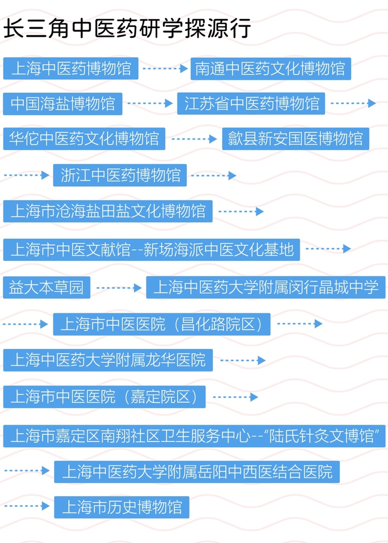 赓续杏林,创联未来。按照“长三角研学旅行教育联盟中医药研学线路”,全线囊括苏浙沪皖多地的17个场所,串联起长三角区域优质中医药文化资源,带领青少年走进博物馆、中学、中医院、药材种植基地等场景,游中学、学中游。