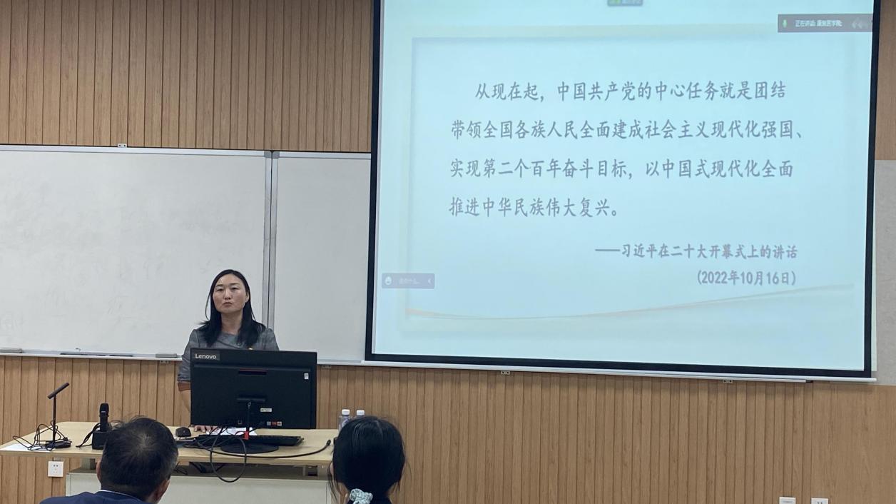 马克思主义学院党总支书记陶思亮教授作“中国式现代化与坚持中国共产党领导”专题讲座。他从大会的重要意义、代表的产生、报告的起草和大会主要成果等方面介绍中国共产党第二十次全国代表大会的概况。随后带领全院师生深入学习领会党的二十大精神,过去5年的工作和新时代10年的伟大变革,开辟马克思主义中国化时代化新境界,新时代新征程中国共产党的使命任务,中国式现代化的中国特色和本质要求等方面的内容。他希望学生们坚定不移听党话、跟党走,怀抱梦想又脚踏实地,敢想敢为又善作善成,立志做有理想、敢担当、能吃苦、肯奋斗的新时代好青年。