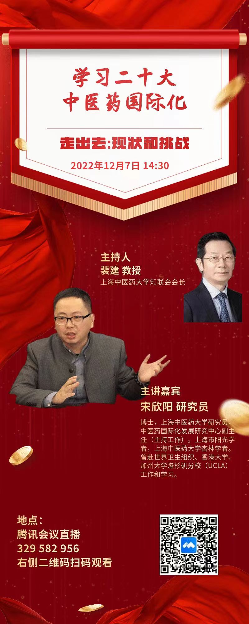 中国共产党第二十次全国代表大会报告明确提出要“促进中医药传承创新发展”,校知联会举办“学习党的二十大精神——中医药国际化走出去:现状和挑战”学术座谈会,客观分析新时期中医药国际化发展面临的机遇,并就如何从个人及团体的角度应对困难、发挥作用进行充分讨论,引领激励广大会员立足岗位、砥砺前行,为中医药创新发展作出贡献。