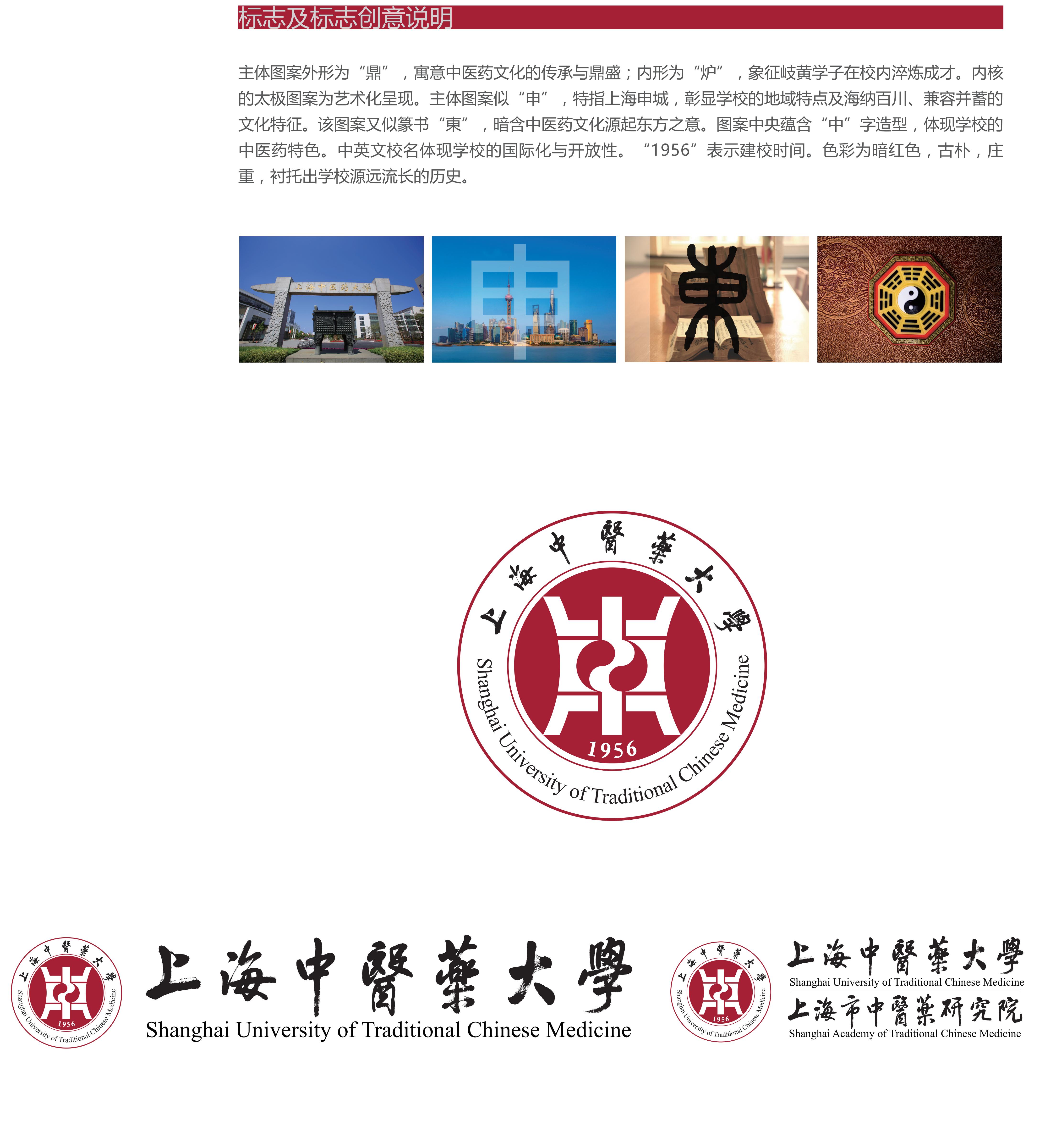 伟德国际victor1946官网校标主体图案外形为“鼎”,寓意中医药文化的传承与鼎盛;内形为“炉”,象征岐黄学子在校内淬炼成才。内核的太极图案为艺术化呈现。主体图案似“申”,特指上海申城,彰显学校的地域特点及海纳百川、兼容并蓄的文化特征。该图案又似篆书“東”,暗含中医药文化源起东方之意。图案中央蕴含“中”字造型,体现学校的中医药特色。中英文校名体现学校的国际化与开放性。“1956”表示建校时间。色彩为暗红色,古朴,庄重,衬托出学校源远流长的历史。