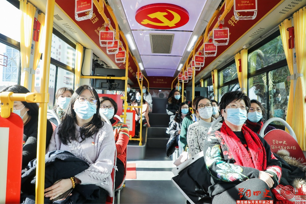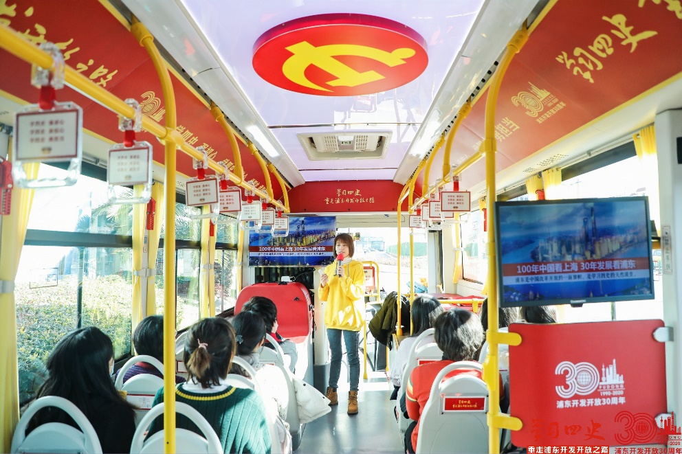 不同于传统固定的“四史”学习教育阵地,红色巴士课堂是一个移动的“四史”学习教育平台,通过边行车、边参观、边讲课、边互动的学习形式,让“四史”学习教育的过程更具代入感。讲解员“历史选择了浦东”“从一只羊到30多万金融从业人员”“从超级CBD到世界会客厅”“从上交所鸣锣到科创板落地”等九个板块,涉及20余个地标建筑、30多个浦东故事、超100页图文解说、7000字文稿,以扎实的内容、新颖的形式、生动的讲解构造沉浸式的学习体验,实现了车内讲解与车外景观的完美融合,在陆家嘴的天然“四史”课堂中为广大党员上一堂身临其境的“四史”学习教育课。
