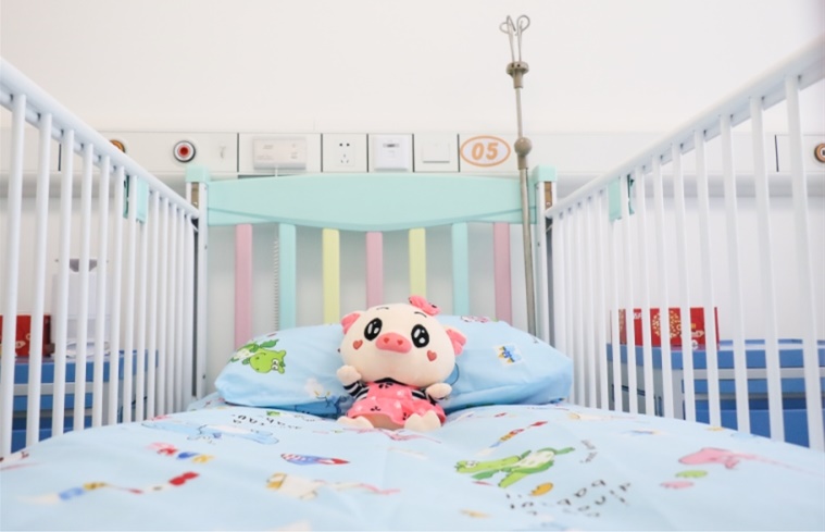 病房以儿童房的风格进行装修,布置活泼温馨,墙壁上贴满了可爱的卡通壁纸,儿童床上有护栏预防坠床发生,床上用品选用最安全的儿童专用品,有可爱的小动物图案增添童趣,床上还摆着一只可爱的猪宝宝陪伴患儿以缓解紧张情绪。细节之处体现了医院为儿科病房建设倾注的无微不至的爱。