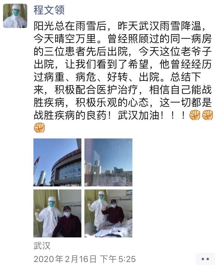 “我们一起经历过武汉的每一个时辰,经历过几年来武汉最大的一场雪。”曙光医院第一批援鄂医疗队队员程鑫也说:“春天就快到了,相信我们的胜利也就在不远的将来!”在金银潭医院里,有高唱着《我和我的祖国》等待复查核酸等待出院,曾去过华南海鲜市场,1月22日被确诊的厨师;有从病房中走出来,在空旷处一招一式颇有风范地打起了太极拳的老爷爷……看着眼前的美好景象,程鑫不禁眼眶湿润。武汉,请继续加油!
