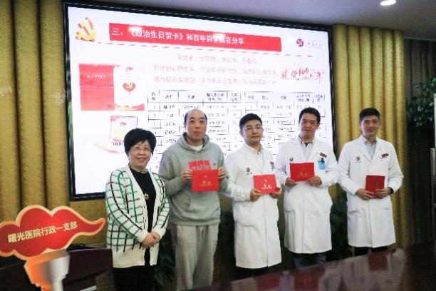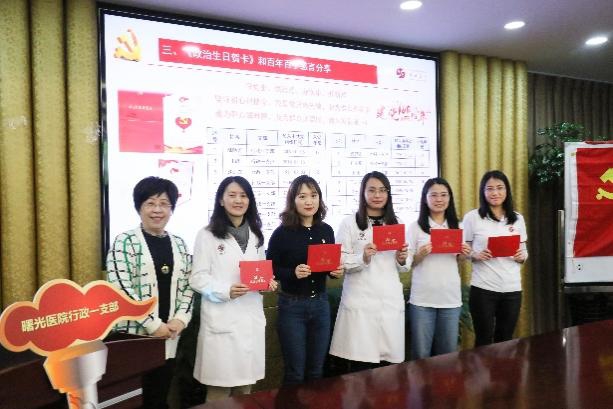 支部大会由行政第一党支部书记江云主持。江云领读了在学习中增强信仰信念信心、开展党史学习教育的根本遵循和从党史中汲取初心力量等内容。为党员庆祝政治生日,医院党委书记马俊坚为两个党支部的15位党员颁发了建党百年的《政治生日贺卡》,拉开集体政治生日“七个一”活动的序幕,包括一张温情贺卡、一次庄严宣誓、一个初心故事、一场暖心谈话、一本革命书籍、一次志愿服务和一次红色打卡等内容。