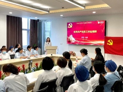 4ACCU病区护士长黄凤是一名“80后”党员,党龄10年。2020年新冠疫情突发,黄凤同志主动请缨,除夕出征,作为上海市第一批援鄂医疗队队员驰援武汉,任抗疫前线党总支第六党支部书记,在武汉市金银潭医院重症病房一线抗疫67天。因在前线的突出表现,先后获上海市优秀共产党员、上海市卫健委三八红旗手、上海市抗击新冠先进个人、上海市杰出护理工作者、上海市卫健委五四青年奖章等荣誉称号。抗疫归来后,黄凤一头扎入到临床护理工作中,作为新时代的青年人,作为一名党员护士长,她身兼双重使命,始终坚守岗位,出色地完成工作。为继续弘扬抗疫精神,进一步发挥先锋模范作用,护理第一党支部设立“优秀共产党员(黄凤)工作站”。卢根娣为优秀共产党员工作站授牌。