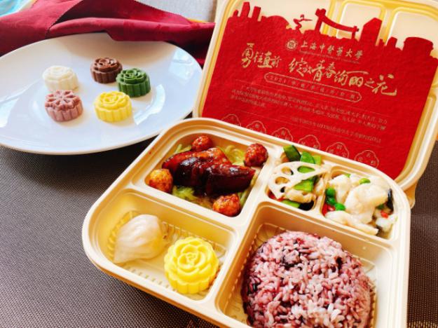 打开餐盒,精美别致的摆盘造型,色彩缤纷的食材组合,饱含寓意的菜品设计,充满惊喜:卤蛋烧肉(大展宏图)、糟溜鱼片(如鱼得水)、五彩炒素(前程似锦)、虾酱莴笋(一帆风顺)、鲜虾蒸饺(蒸蒸日上),再搭配一道五色花糕作为餐后甜点。可口美味的饭菜、设计精美的餐盒,每一处细节都体现了后勤服务人员对毕业生的用心与细心,寄托着母校食堂对广大毕业学子的衷心祝福及深切期望。