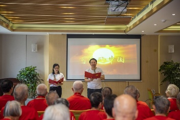 综合三支部党员刘艳独唱经典红歌《红梅赞》,勾起老人们无限美好的回忆。李玲霞和徐惟诚两位党员以真挚的情感和动人的声线,声情并茂地朗诵《可爱的中国》,在抒发爱国爱党之情的同时向老人们传递了温暖和快乐。随着青年党员们“唱支山歌给党听”“再唱山歌给党听”的歌声,颐养院的工作者们身着整齐的服装踏着优雅的舞步将现场气氛推向了高潮。最后大家共同点亮蜡烛,祝伟大的党生日快乐,祝伟大的祖国繁荣昌盛。