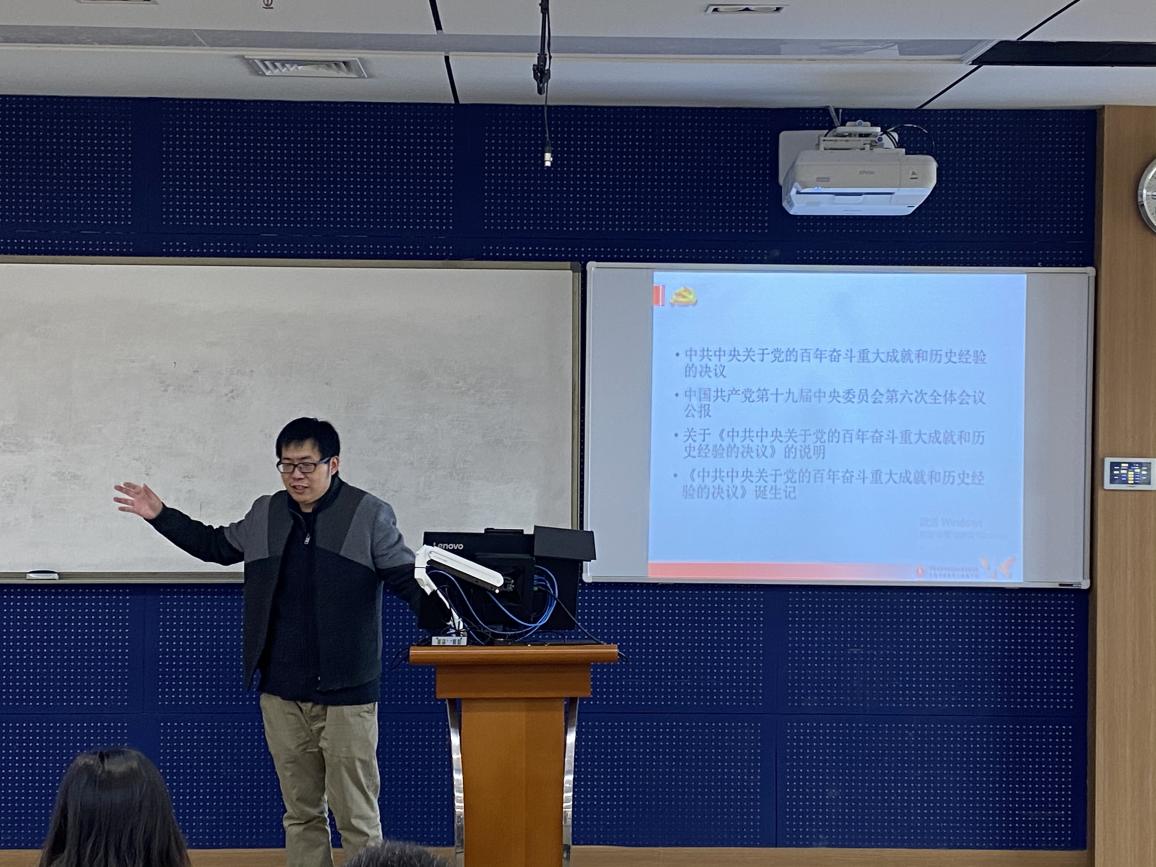为进一步开展党史学习教育,深刻领会党的十九届六中全会精神,12月8日下午,公共健康学院党总支在6302举行政治理论学习会,专题学习党的十九届六中全会精神。浦东区委党校党建研究中心讲师郑智鑫受邀以《百年奋斗铸就伟业,以史为鉴、开创未来——学习贯彻党的十九届六中全会精神》为题作讲座。学院全体教职工、学生党员、入党积极分子等100多名师生参加。学习会由学院党总支副书记、院长赵海磊主持。