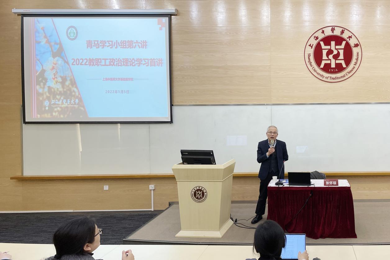 人民健康是民族昌盛和国家富强的标志。当前,在深入推进党的十九届六中全会精神学习之际,1月5日,基础医学院举办2022年教职工政治理论学习首场报告会暨青年马克思主义者学习小组专题学习会。邀请上海市政协教科文卫体委员会常务副主任张怀琼作《人民健康背景下中医药发展与思考》专题讲座。学院各教研室教师、青马小组全体学员、研究生党支部成员等80余人参加学习。学院党委副书记陆佩丽主持学习会。