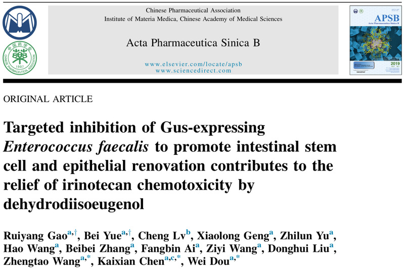 近日,伟德中药研究所陈凯先院士、王峥涛教授和窦薇研究员团队在ActaPharmaceuticaSinicaB发表题为TargetedinhibitionofGus-expressingEnterococcusfaecalistopromoteintestinalstemcellandepithelialrenovationcontributestothereliefofirinotecanchemotoxicitybydehydrodiisoeugenol的研究论文,揭示了中药肉豆蔻活性成分去氢二异丁香酚在缓解伊利替康化疗肠毒性中的积极疗效,提出“Gus表达细菌-宿主-伊立替康轴”作为减轻化疗消化道副反应的药物研发新策略。伊立替康(Irinotecan,CPT11)是一种天然生物碱——喜树碱的半合成类似物,广泛用于治疗多种恶性肿瘤,包括结肠癌、胃癌、胰腺癌、卵巢癌等。然而,CPT11的临床应用受到延迟性腹泻的限制。大量研究已经阐明了CPT11诱导腹泻的机制,强调了其代谢产物7-乙基-10-羟基喜树碱(SN38)的肠肝再循环和细菌β-葡萄糖醛酸酶(Gus)的参与。现有针对CPT11肠毒性