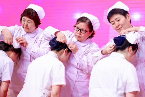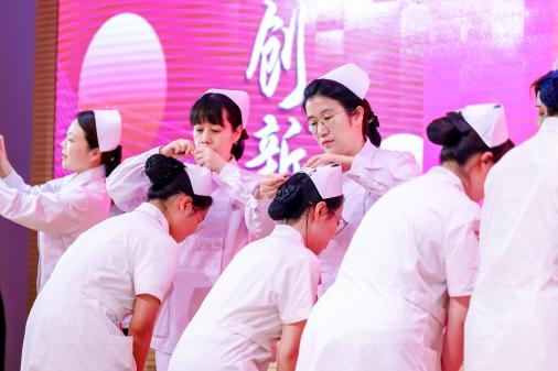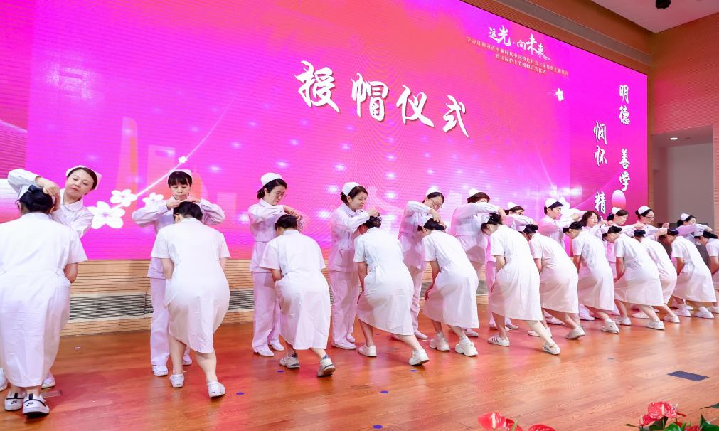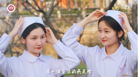 来自伟德9家附属医院的护理部主任及学院教师代表,为近200名学生逐一戴上神圣的燕尾帽。