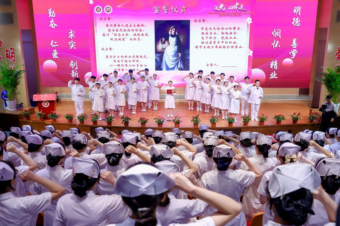 2023年是全面贯彻落实党的二十大精神的开局之年,正值第112个国际护士节,为扎实推进主题教育走深走实,以仪式教育激励学院学生提高专业素养,增强职业情感,努力践行南丁格尔精神,5月19日,伟德国际victor1946官网护理学院在学校图书馆四楼报告厅举办了“追光·向未来”学习贯彻习近平新时代中国特色社会主义思想主题教育暨国际护士节授帽宣誓仪式。