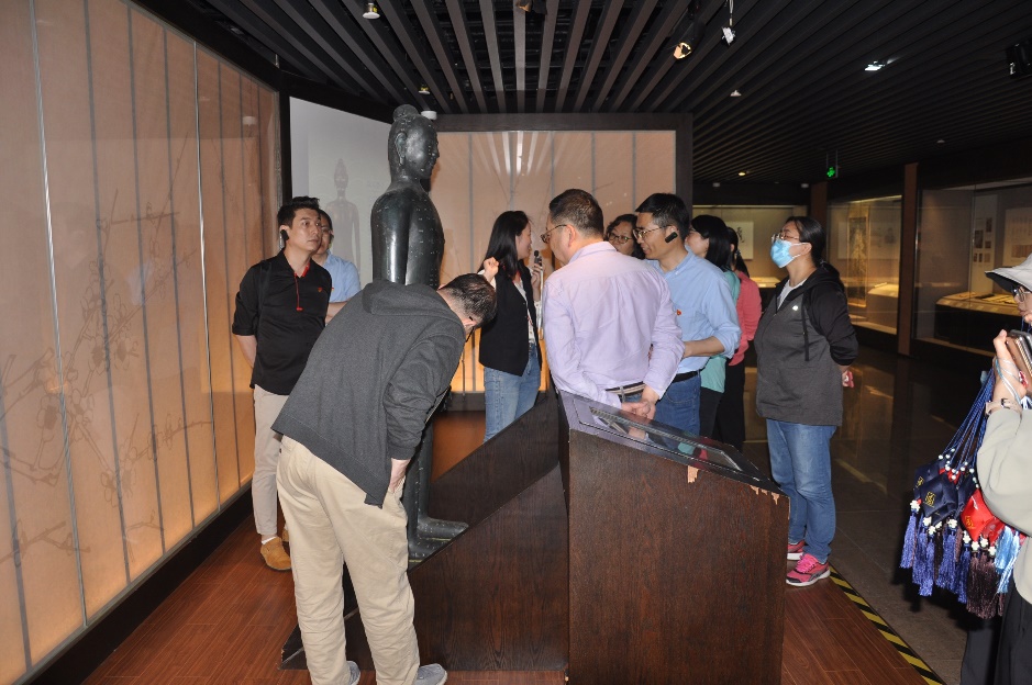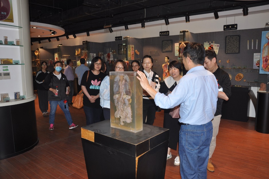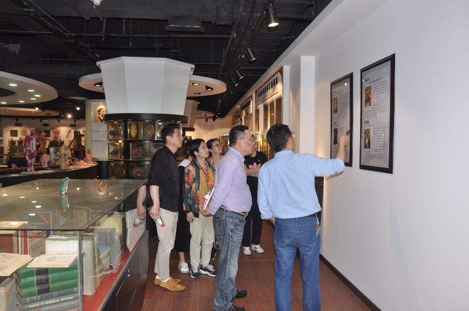 会后,一行人参观伟德人体与经穴解剖学陈列馆、遗体捐献文化走廊和人体解剖学实验室等。邵水金介绍镇馆之宝“镜面人”及其捐献者事迹,讲述中医腧穴解剖学发展历程,着重介绍全身腧穴塑化标本这一具有中医特色的珍贵展品。