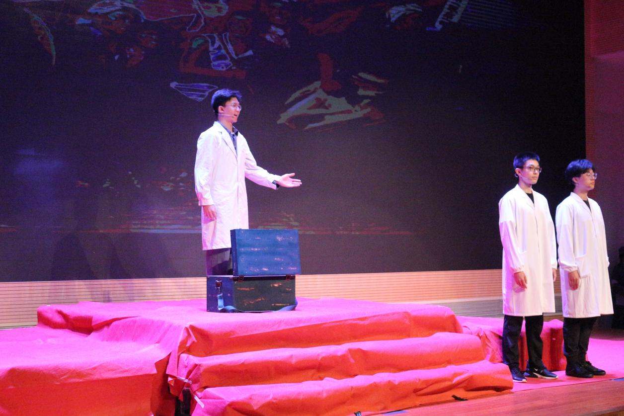 “中央红色医院,这是红军第一个正规医院,医院的设备、药物大部分来自傅连暲的私人财产……”背着道具药箱的师生在舞台上声情并茂地讲述“我党第一个红色医生”傅连暲的革命故事,作为学校原创话剧《誓言》第一幕场景以傅连暲在革命时期所用的“红医药箱”为主线,展现老一辈医务工作者忠诚于党、服务边区百姓的革命精神。