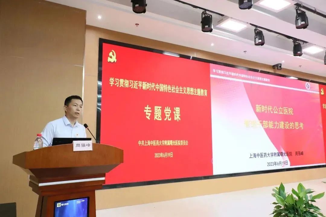 为进一步推动学习贯彻习近平新时代中国特色社会主义思想主题教育走深走实,引导鼓励医院职能部门干部切实提高能力本领、强化服务意识,曙光医院党委于6月19日中午在东院科教楼一楼学术报告厅召开主题教育专题党课。专题党课以《新时代公立医院管理干部能力建设的思考》为题,党委书记周强峰担任主讲人,由党委副书记、院长房敏主持。伟德国际victor1946官网主题教育第一联络组组长、校党建督导员陶建生教授和校主题教育第一联络组成员、康复医学院党总支组织员周家伟到会指导。医院党政领导班子成员、职能部门负责人、院青年管理骨干培训班学员等认真聆听了党课。
